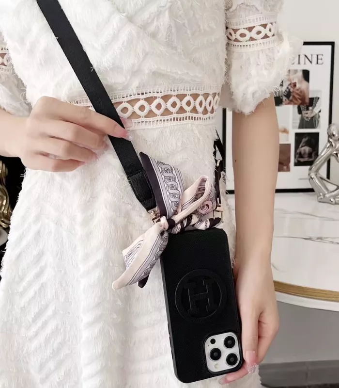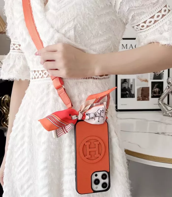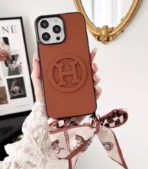 Sleek Luxury: Hermes Leather iPhone Case with Shoulder Strap for iPhone 12 to iPhone 16
